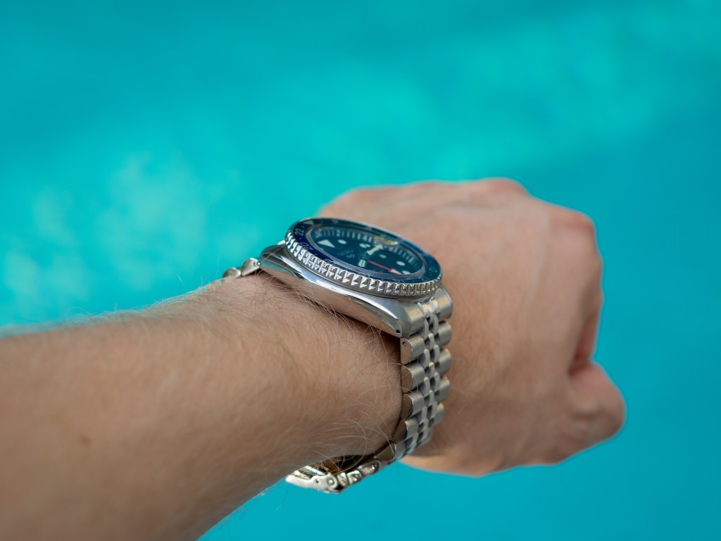 The SSK001 comes on a solid link (including end links) jubilee bracelet with a folded metal clasp. Unlike the folded clasps of vintage Rolex/Tudor, this thing is thick and durable and doesn’t feel at all cheap, and when paired with the nearly 43mm watch head, it has a noticeable heft to it that I think many will appreciate. The most stunning aesthetic feature of the watch has to be the sapphire-coated bezel insert. I haven’t seen a watch with such an application before and it really is beautiful in person. While it often looks like glossy-black ceramic, if you catch it at the right angle in the right light, the bottom (daylight) half of the bezel reveals its beautiful mirror finish that can occasionally blind the wearer with one’s own frightening countenance. The bezel is bidirectional, as this isn’t a dive watch and doesn’t need the safety feature of a unidirectional one, and it isn’t ratcheted. No clicky bezel here, sadly, but on the plus side, it means that you can line that arrow up with the chapter ring perfectly. No more quality control complaints for Seiko. Smart move, guys. It also means that if you have business associates in Tehran you can keep track of timezones that are offset by half an hour. Ok, considering the state of the world, you probably don’t have business there, but to all my lovely Glendale Persian neighbors, this is the watch for you!