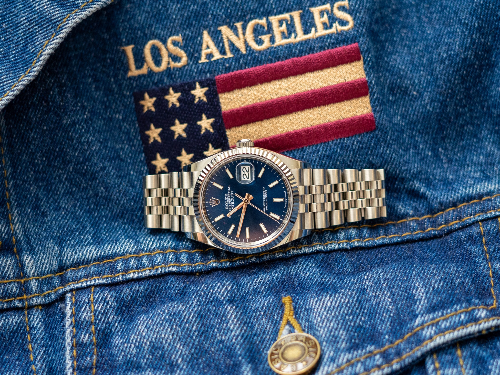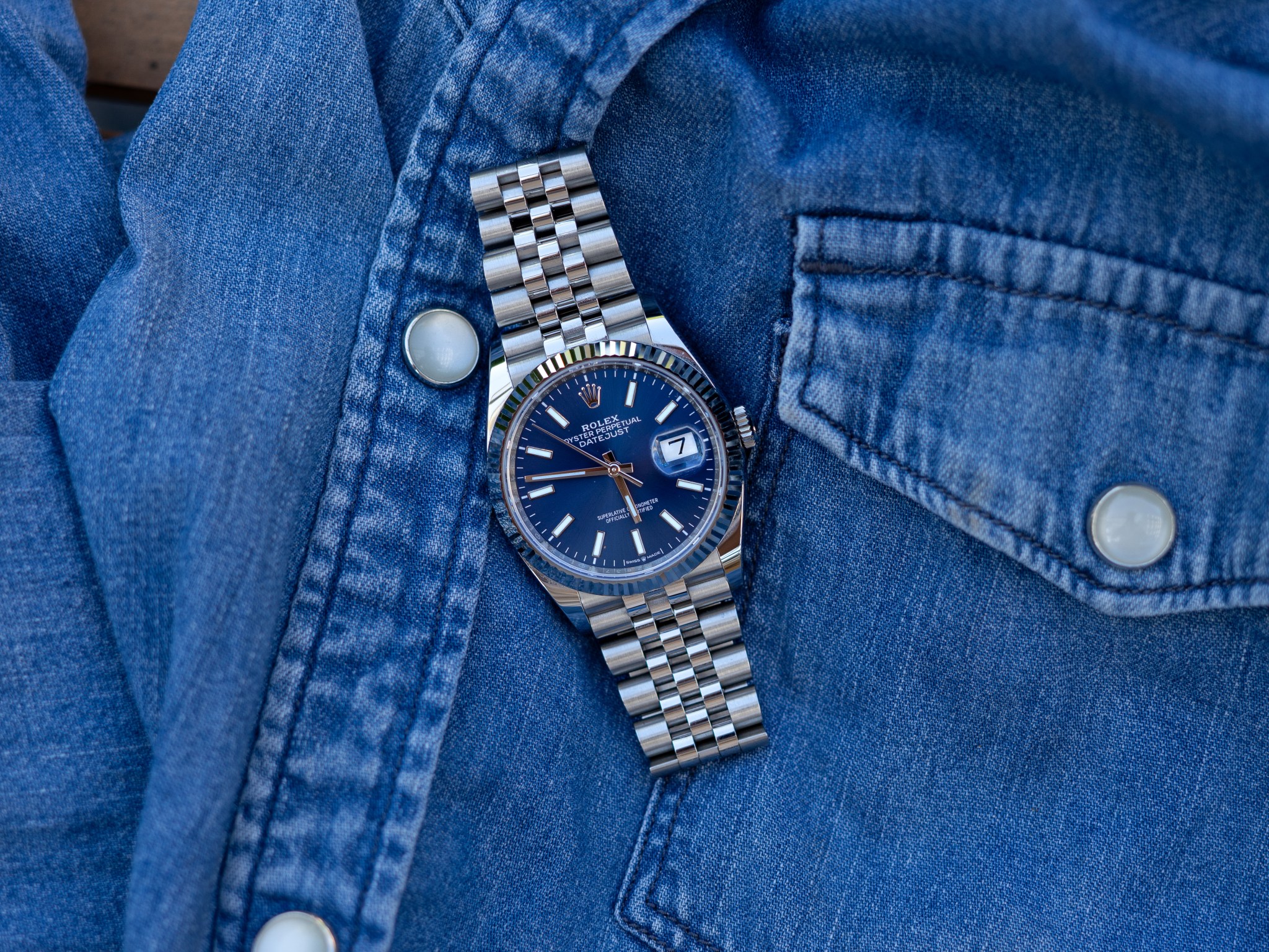 With an 18-karat, white gold, fluted bezel, solid link Jubilee bracelet, and radial sunburst blue dial, the 126234 assaults the eyes with icy-hot incandescent light. This watch is flashy! I’m not a flashy guy, but on the rare occasion that I’m required to dress up, I don’t mind playing the part.