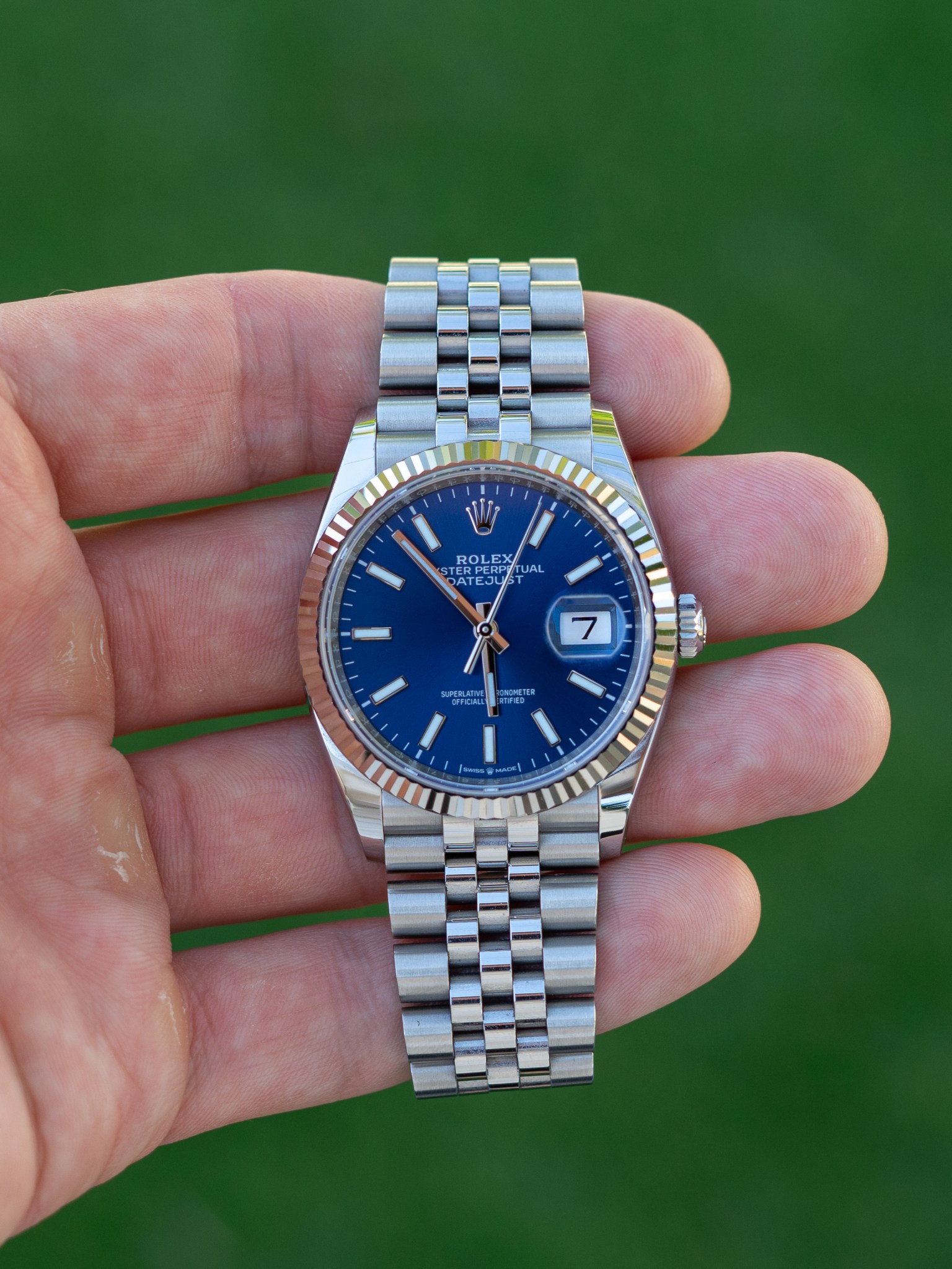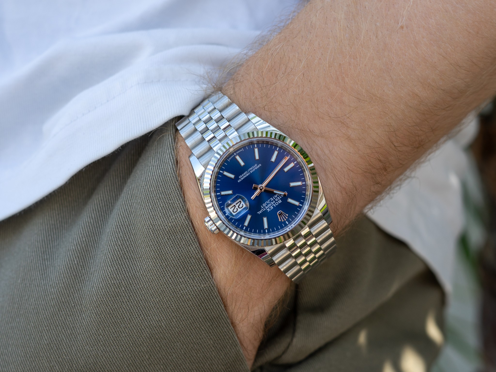 In order to check all the boxes, the Datejustiest Datejust needs not only a fluted bezel, but also a flashy patterned bracelet to match. Again, this is all just my opinion and nobody in the world aside from watch aficionados (losers) cares, but I have always found the polished center link Oyster bracelet to be an eyesore. That big flat polished plane may look nice when brand new, but it’s a scratch magnet and ends up looking dirty and worn with moderate wear. The Jubilee, on the other hand, with its three rounded interlocking center links, avoids this problem and provides a similar pattern to the bezel that brings the piece together. The smaller links also allow for extra comfort as they articulate around the wrist. Unlike the vintage, hollow center link models that stretch significantly with time, the modern Jubilee (solid center links) looks refined and light, but feels well built and sturdy and it inspires confidence that it will last the ages with you.